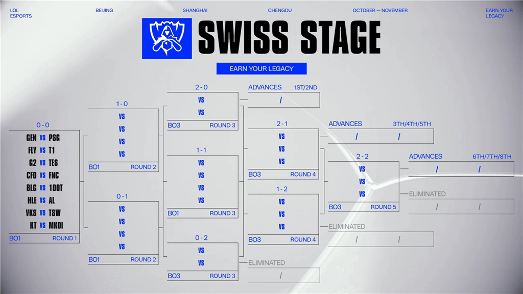 「スイスステージ」では、T1が加わった16チームの中から先に3勝を挙げたチームから勝ち抜けていき、8チームが「ノックアウトステージ」に進出するが、最初の組み合わせはこのドローショーによって決まる。