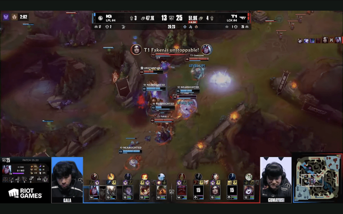 ゲーム3では、T1が初めてブルーサイドに。レートスケールのiGの構成に対して、T1は序盤から積極的に攻め込み、Onerのシン・ジャオ、Gumayusiのユナラなどがキルを重ねてスノーボールし2勝目。リーチをかける。