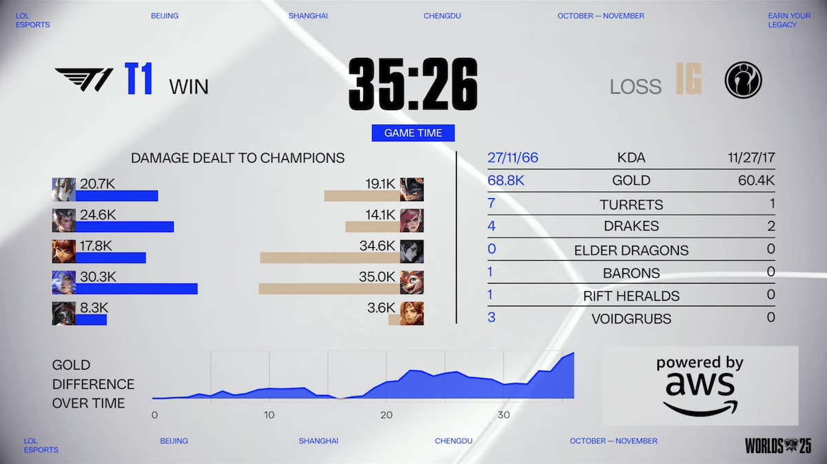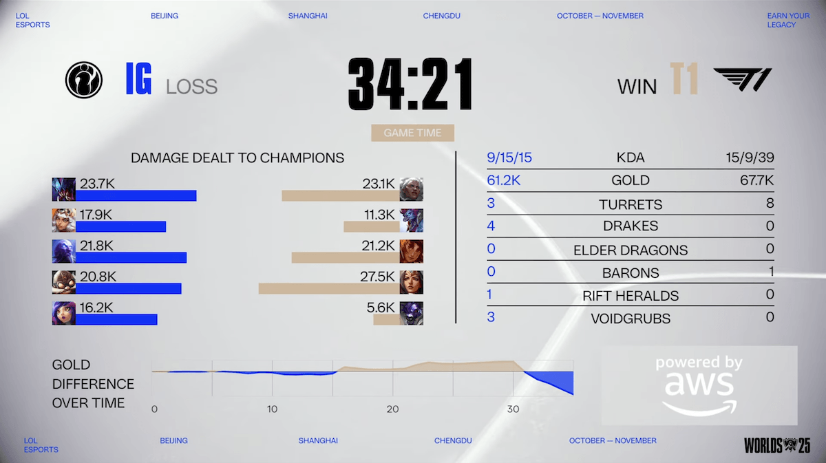 試合はフィアレスドラフトで、Bo5(3ゲーム先取)。ゲーム1はiGがドラゴンソウルを獲得するなどリードを築くが、FakerのタリヤのCCからの集団戦などでT1が逆転勝利。ゲーム2もiGが序盤からリードしシーソーゲームの様相だったが、TheShyのサイオンがFakerのアカリを抑えるなどして、iGが押し切る。