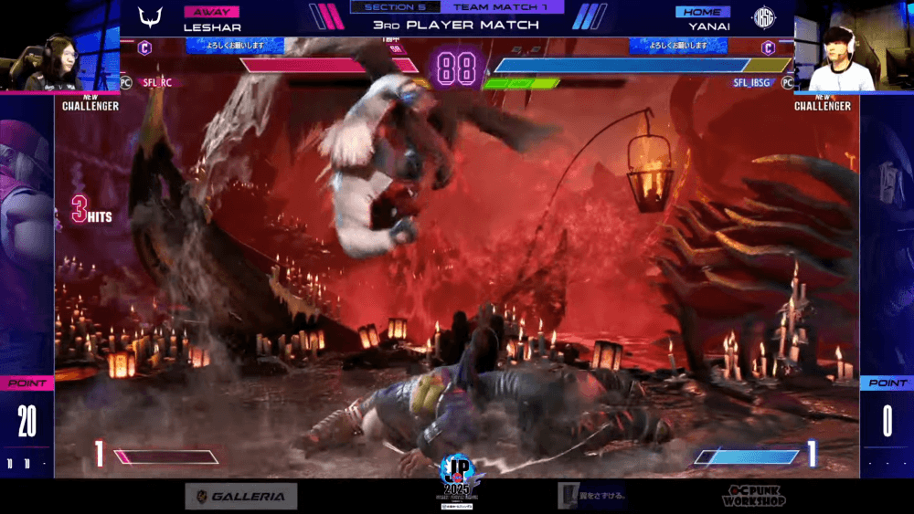 大将戦は、LeShar(テリー)に対してヤナイ(ベガ)。「EVO France 2025」を制したばかりでLeSharが勢いに乗るかと思いきや、ヤナイの技がことごとく刺さり、いきなりリーチをかける。しかしインターバルを経てLeSharも落ち着きを取り戻し、ラウンドごとに攻守交代しながら迎えた最終ラウンド、LeSharはダメージよりも入れ替えを優先してヤナイを画面端に囲い込み続け、大将戦を制した。