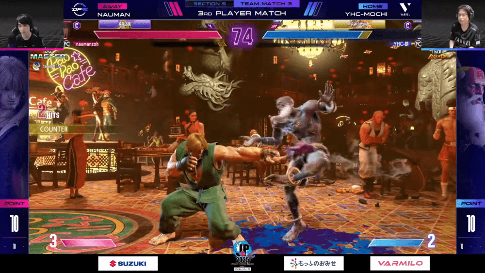 大将戦は、ナウマン(舞)に対してYHC-餅(ダルシム)というオーダーに。YHC-餅のリーチとヨガファイヤーを生かした攻撃で追い詰められたナウマンはケンにキャラ変更するが、2本目も取られてリーチをかけられてしまう。ここからナウマンはじわじわ近づきながら的確に技を当てていき、フルセットフルラウンドに持ち込む。そして最後は互いにミスも見せながら、気合の中足ラッシュからナウマンが大逆転勝利を果たした。