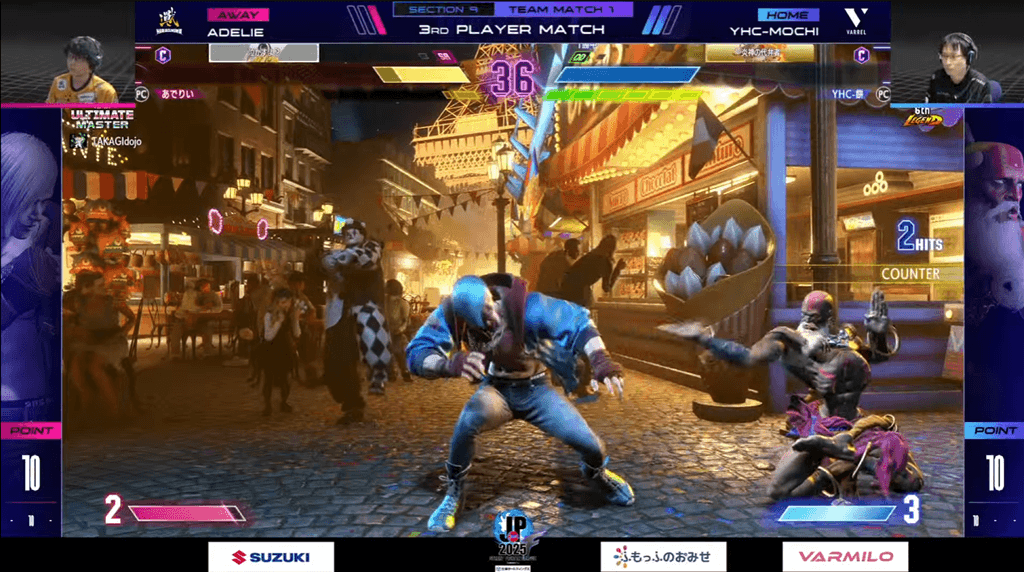 残るはYHC-餅(ダルシム)とあでりい(エド)の大将戦。あでりいは第8節でIBGS鶏めしに快勝しており、未勝利のYHC-餅には厳しい相手と思われた。しかし、試合が始まるとYHC-餅の通常技があでりいを封じ、一気に2セットを連取。