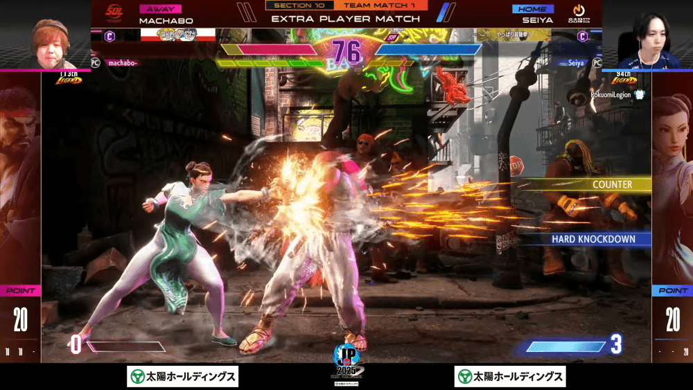 G8Sに追いつくためには延長戦での勝利が必須。そんなまちゃぼー(リュウ)とSeiya(春麗)の対決は、まちゃぼーが再三画面端に追い詰めるも、Seiyaもドライブパリィや小技からのコンボで押し返してNOJが勝利。この時点でG8Sと同点の260ポイントまで追いついた。