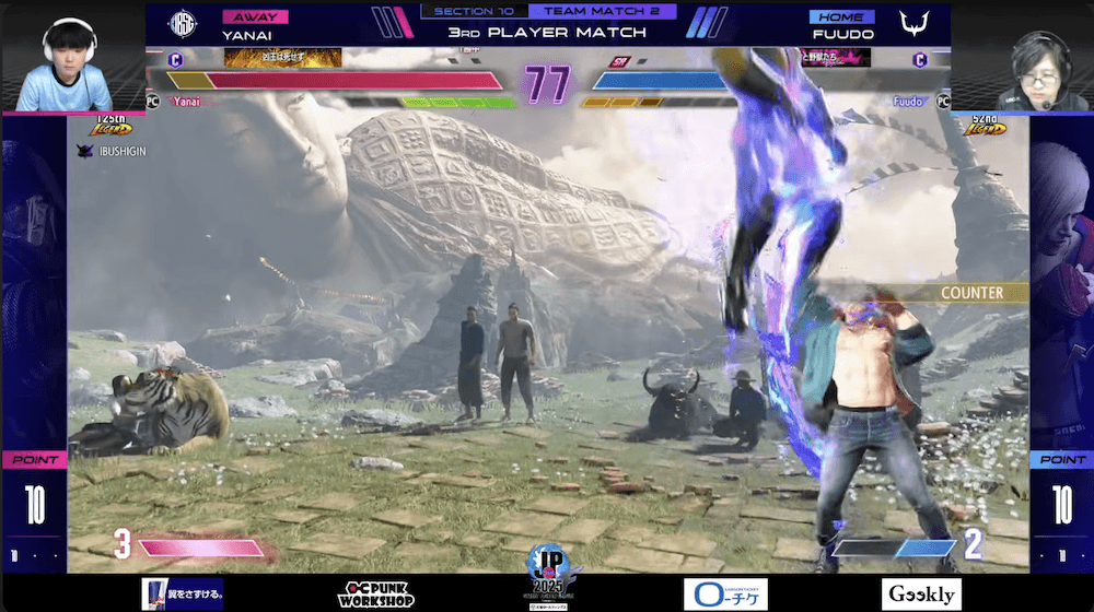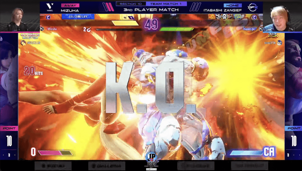 先鋒戦は、2BASSA(ジュリ)がウメハラ(豪鬼)のわずかなスキを突いて勝利。中堅戦は鶏めし(ダルシム)がLeShar(テリー)を攻め立てる場面もあったものの、距離を一気に詰めてくるLeSharのテリーに敗れ10-10に。