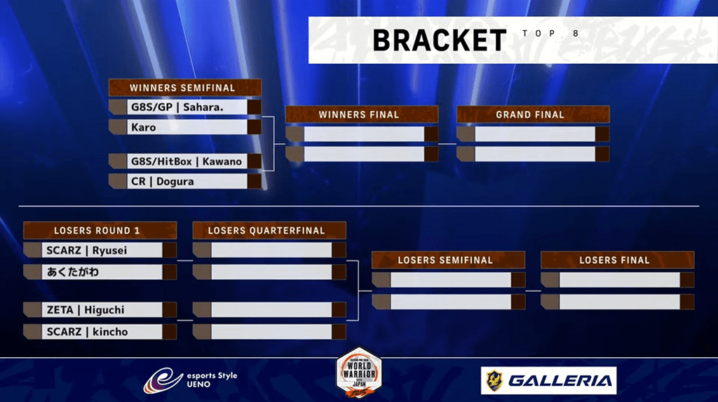 トップ8は、ウイナーズ側はさはら、Karo、カワノ、どぐら、ルーザーズ側はりゅうせい、あくたがわ、ひぐち、きんちょと8人全員のキャラがバラバラとなった。そんな中、ウイナーズ側はカワノがKaro、さはらを下してグランドファイナル進出。ルーザーズ側はきんちょがひぐち、Karo、あくたがわを下してルーザーズファイナルまで勝ち上がったもののさはらに敗れ、グランドファイナルで再びカワノvsさはらの同門対決に。
