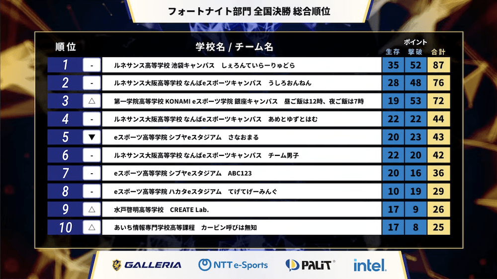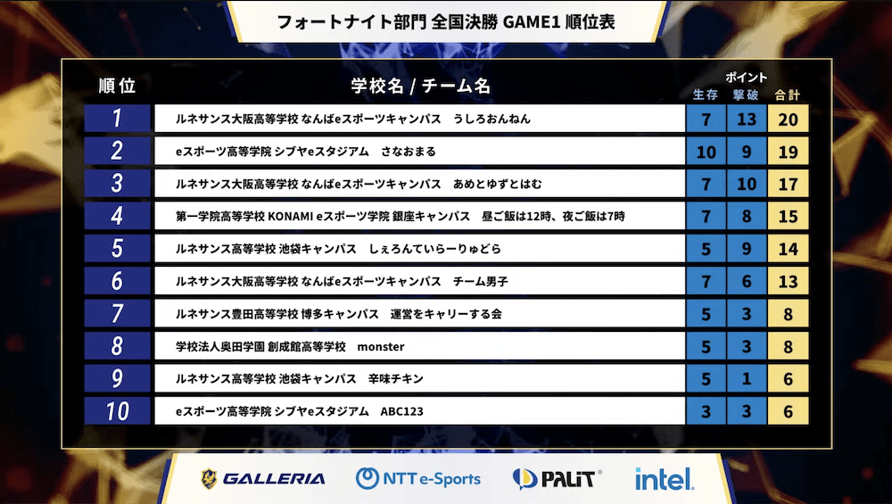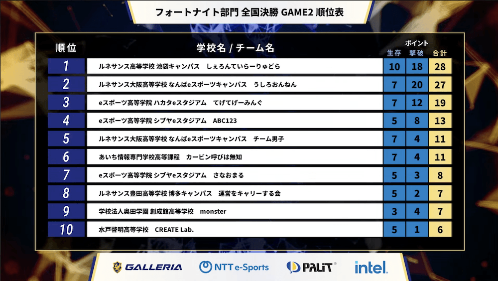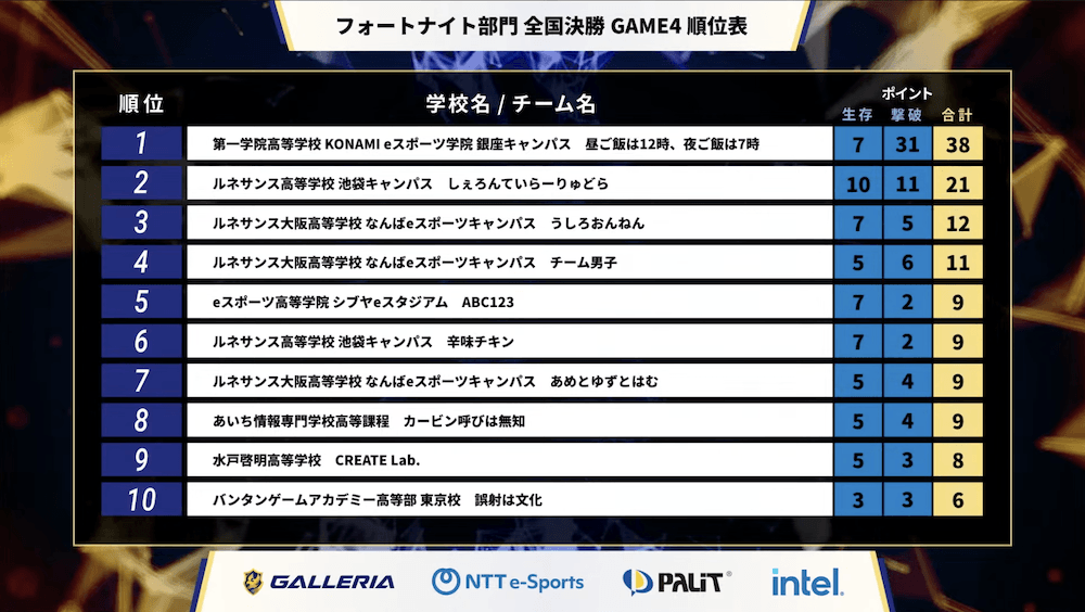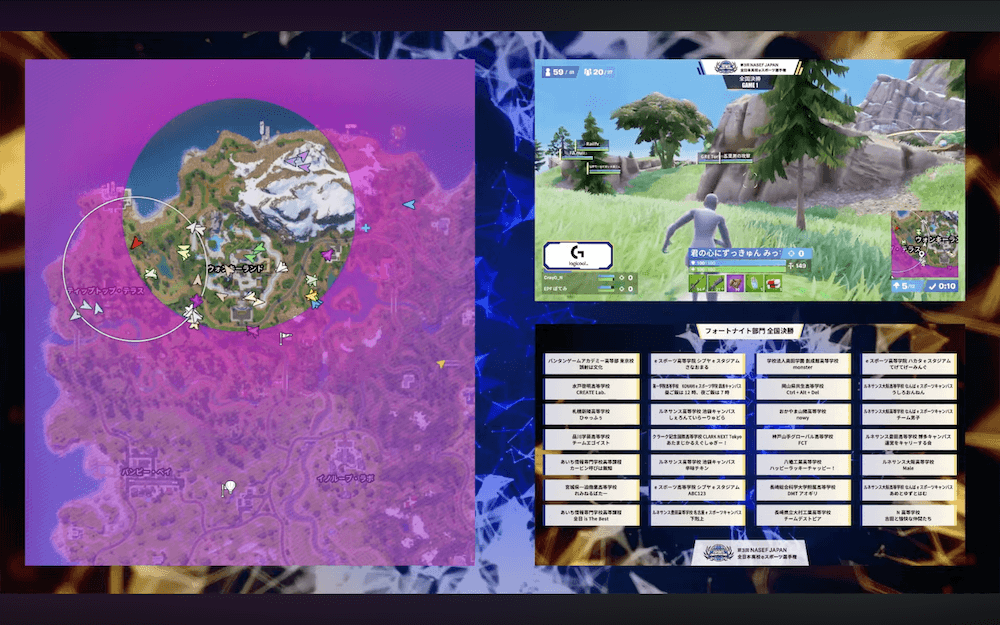 『フォートナイト』部門は、東日本/西日本、全日制ブロック/通信制ブロックからそれぞれ7チームずつ、合計28チームが5ゲームを戦い、高校日本一を決定する。チーム編成はトリオ(3人)で、生存ポイント(ビクトリーロイヤルで10ポイント、以下順位に応じたポイント)と撃破ポイント(1撃破=1ポイント)による合計ポイントで争われた。ルール上、ひとつの学校から最大8チームまでエントリー可能とあって、3チームが決勝進出する学校も見られるなど、実力をつけたチームが年々増えている印象だ。