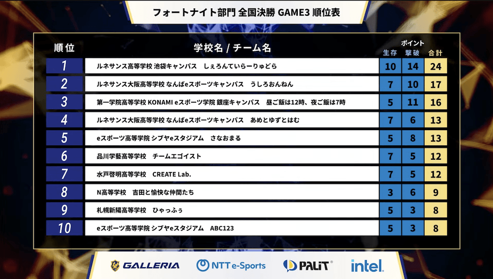 第3回 NASEF JAPAN全日本高校eスポーツ選手権 フォートナイト部門 最終結果