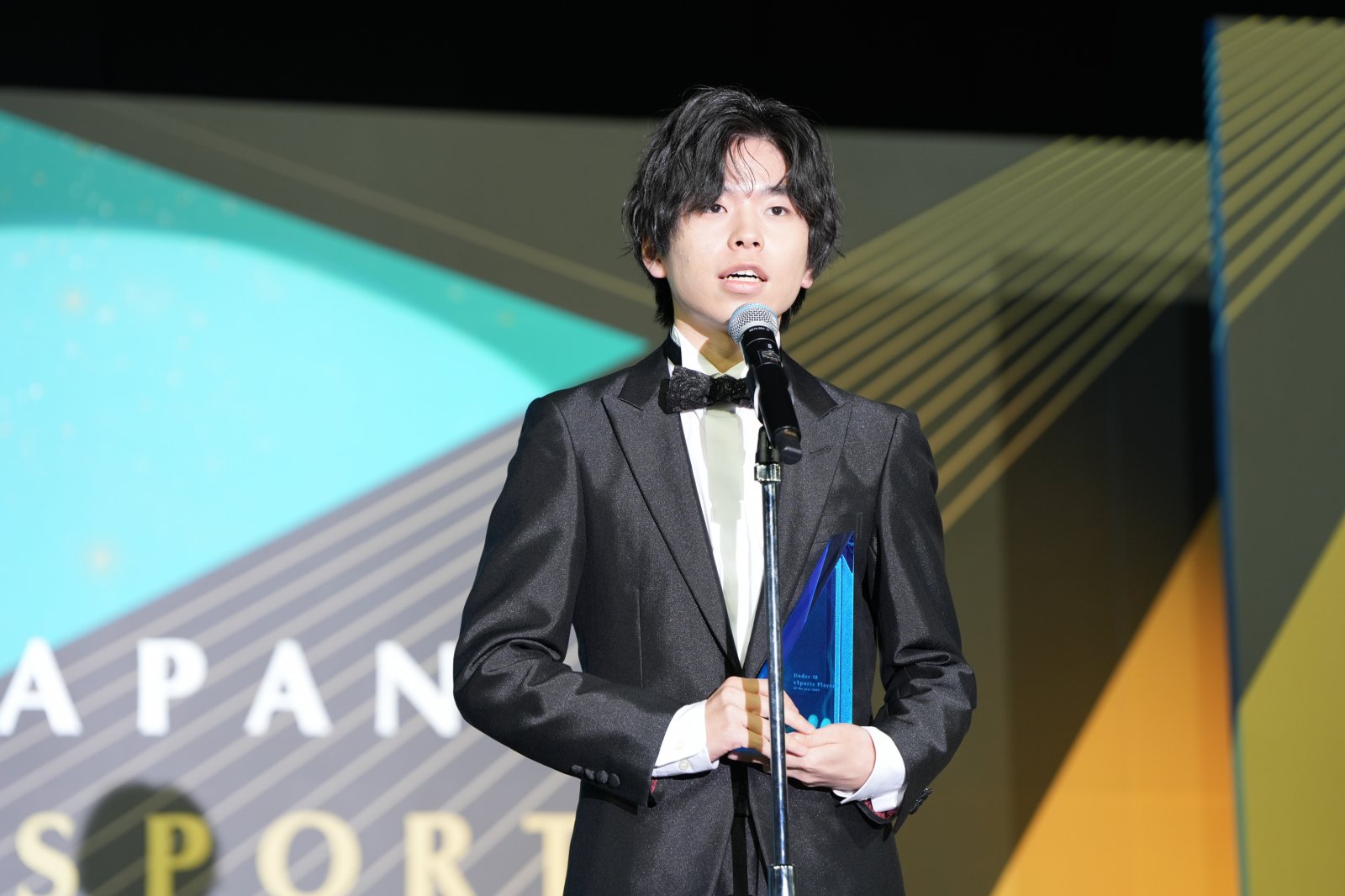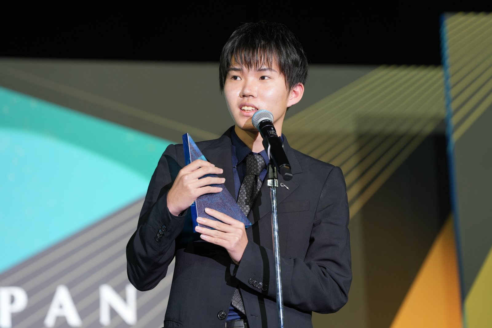 ▲筆者はプレゼンターとして登壇。以前よりその才能に注目し、推薦にも携わらせていただいたゆうき選手が、2冠という最高の結果で応えてくれた。自身の確信を実力で証明してくれた彼に、直接トロフィーを手渡せたことは何物にも代えがたい経験となった