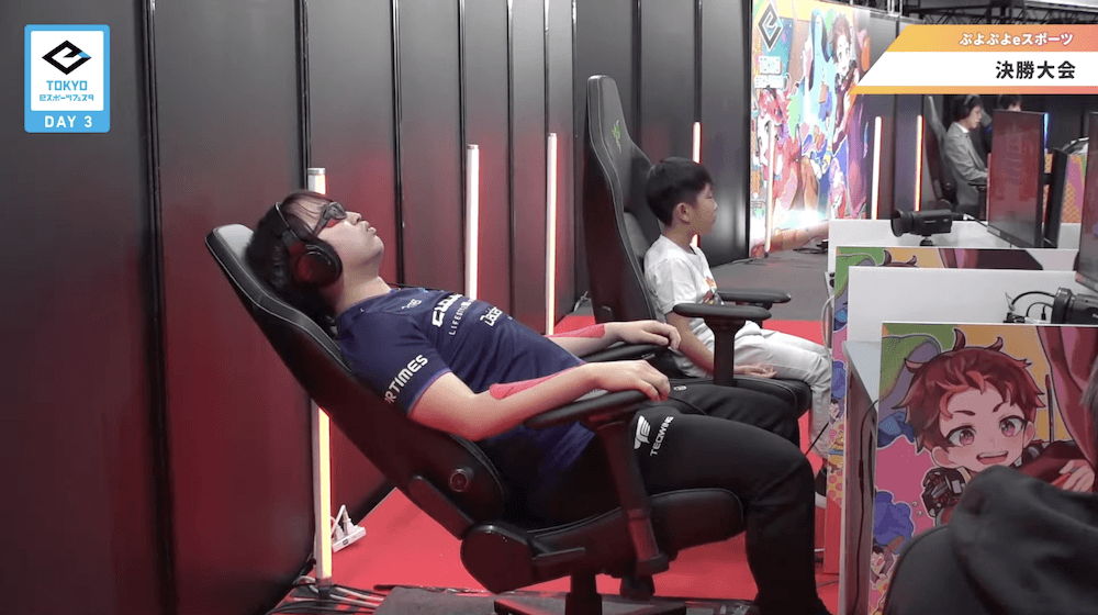 SAKI選手:5本先取というのは『ぷよぷよ』の試合としてはそんなに多くない本数ではあるので、どっちが勝ってもおかしくない、くらいの気持ちで、気楽にプレイすることを心がけていました。その方が普段通りの自分のプレーが出せると信じているんです。気負ったり空回ったりすることも経験してきたので、そういうことはなるべくしないようにと。そのために、“リクライニング”もやっていたりします。