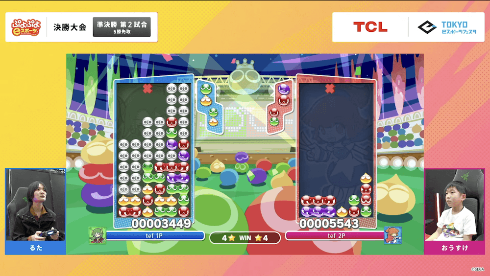 準決勝第2試合は、るた選手と全国都道府県対応eスポーツ選手権では小学生の部で準優勝も飾っているおうすけ選手の対決。相手のぷよをしっかり見て対応するおうすけ選手が3本を連取するが、るた選手も本線の連鎖を重ねてきっちり反撃し、4-4のイーブンに。最終ラウンドは互いに本線を詰みながら、ダブルにダブルで応戦するやり取りの連続に。もつれた中でダメ押しの5連鎖をお見舞いしたおうすけ選手が、5-4で勝利した。