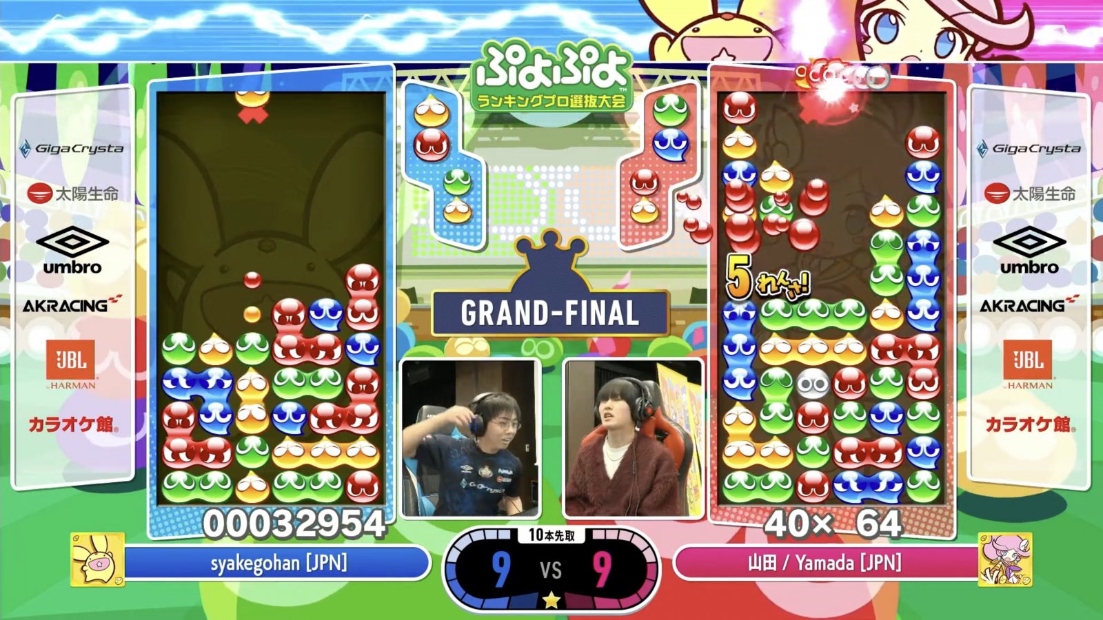 そんな強豪ふたりが勝ち上がったグランドファイナルでは、早い攻めで山田選手のペースを乱していたしゃけごはん選手が9:3と大きくリードを付けるも、山田選手が怒濤の追い上げで、気がつけば9:9のイーブンに。どちらが勝ってもおかしくない最終戦で、反撃に出た山田選手。あとひとつのぷよが足りず、連鎖が止まってしまい、しゃけごはん選手が見事優勝を果たした。