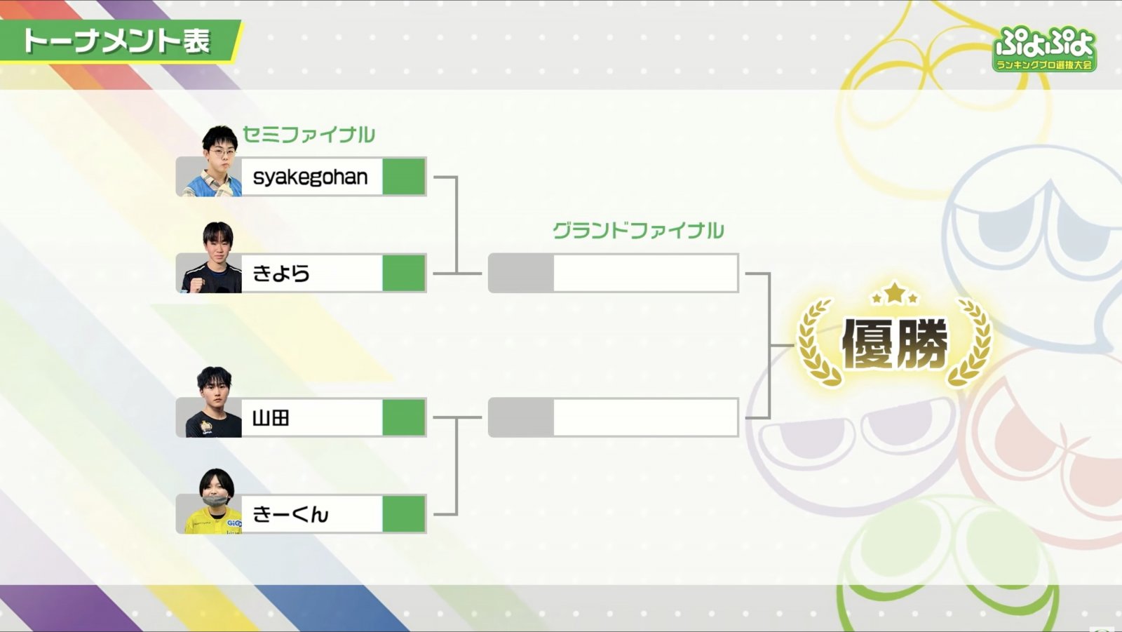 グランドファイナルに勝ち進んだのはしゃけごはん選手、山田選手。しゃけごはん選手は、昨年の「ぷよぷよランキングプロ選抜大会 2025 決勝トーナメント」で惜しくもゆうき選手に敗れベスト4に。山田選手は昨年の「太陽生命 ぷよぷよグランプリ 2025 ファイナル」で見事準優勝を果たし、その後大学進学のために競技シーンを休止していた。