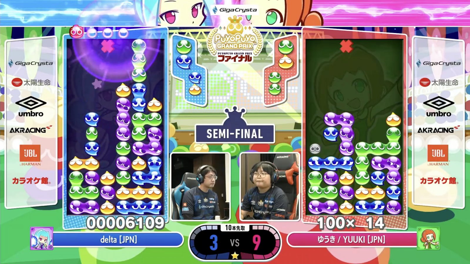 ▲相手の連鎖に対して連鎖で返していくといった攻防が『ぷよぷよ』では度々起こる。しかし、その返していく間に、さらに細かい連鎖をたたみ込み、反撃の隙を与えないスピードの速さで前回王者のdelta選手を圧倒するゆうき選手