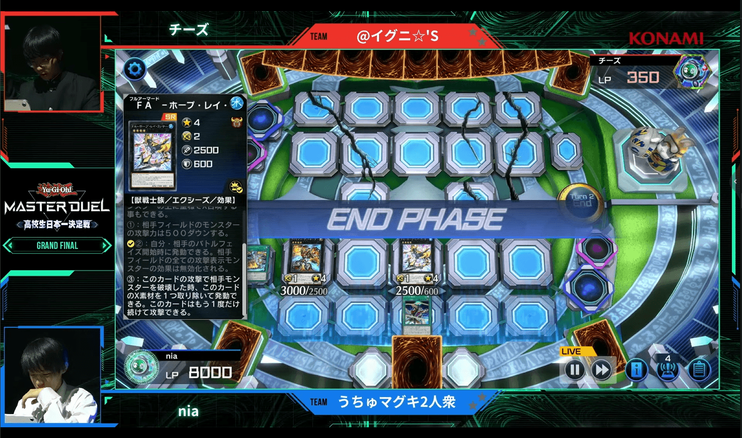 しばしの静寂ののち、お互いのカードの激しい応酬がはじまるが、結果、チーズ選手の強力な妨害カード《増殖するG》が通る形となった。これにより、攻めているはずのnia選手は、厳しい選択を迫られる。