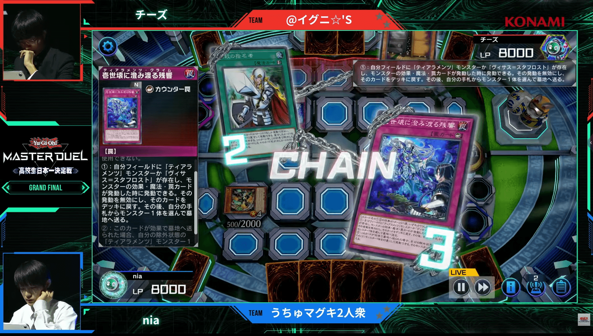 追い詰められた状況ではあったが、チーズ選手は迷いを見せない。《増殖するG》によって増えた手札をフルに活用し、わずか1ターンでnia選手のライフポイント8000を削り切ったのだ。