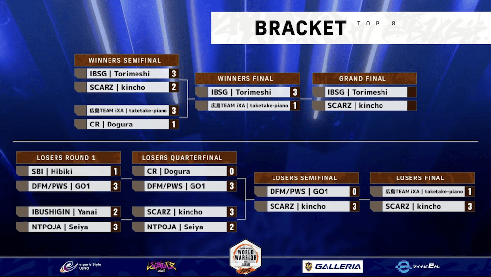 トップ8は、ウイナーズ側は鶏めし、taketake-piano、どぐら、きんちょ、ルーザーズ側はひびき、ヤナイ、Seiya、GO1。順位に応じて、1位と4位、2位と3位という組み合わせになった。