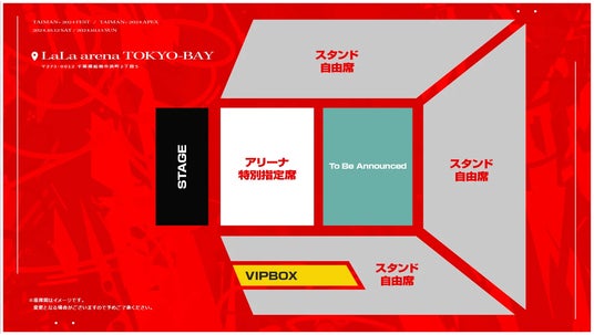 10月12日(土)は「TAIMAN+ 2024 祭天」、13日(日)は「TAIMAN+ 2024 頂天」として、千葉県船橋市の大型多目的アリーナ「LaLa arena TOKYO-BAY(ららアリーナ 東京ベイ)」で開催される。