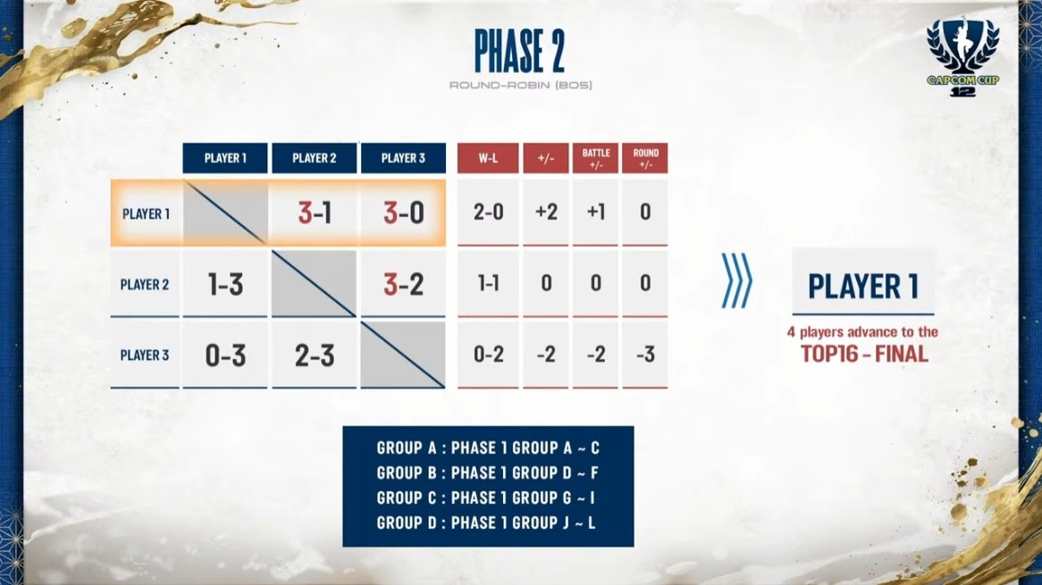 フェーズ2では、3つのグループから集まった3名ずつの4グループ(グループA=フェーズ1のA~C)、グループB=フェーズ1のD~F、グループC=フェーズ1のG~I、グループD=フェーズ1のJ~L)で総当たり戦を実施。上位1名ずつ4名がトップ16に進出する。