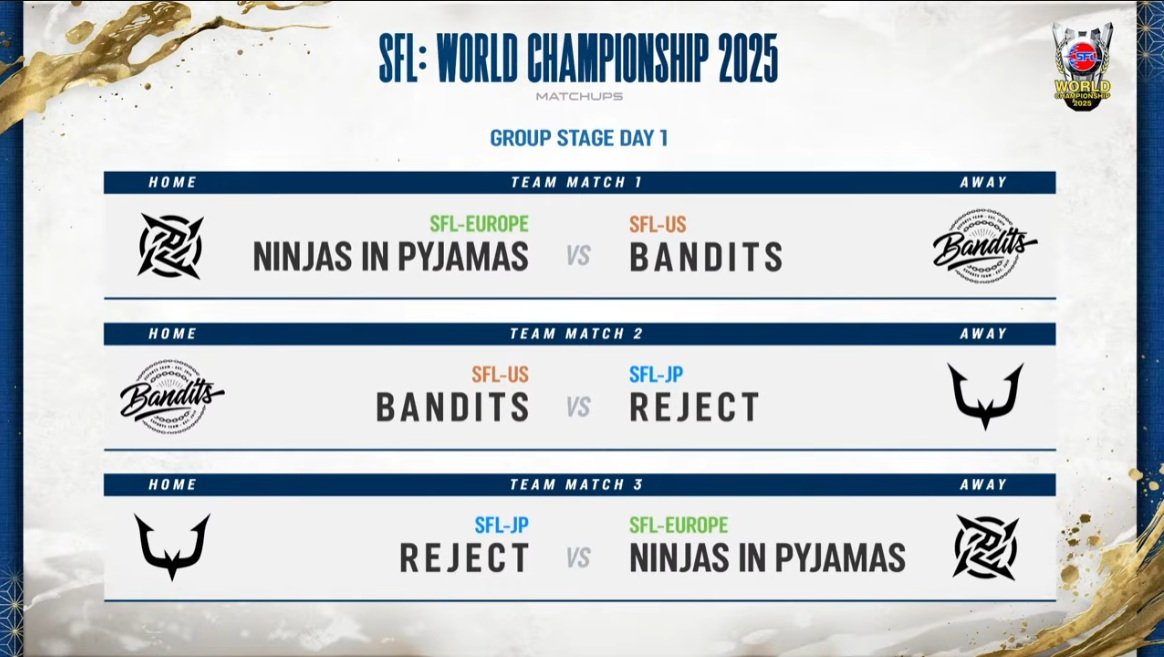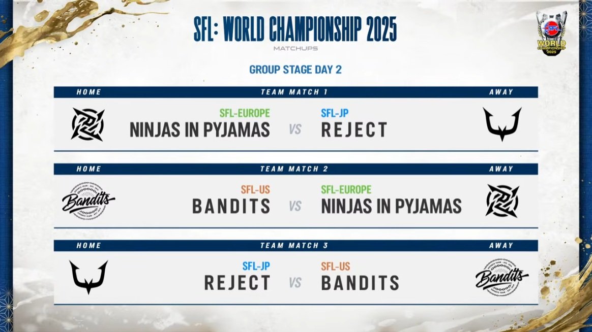 「SFL:ワールドチャンピオンシップ」の組み合わせは以下の通り。3月13日(金)にデイ1、3月15日(日)にデイ2を実施。デイ2はそのままグランドファイナルも行われる。