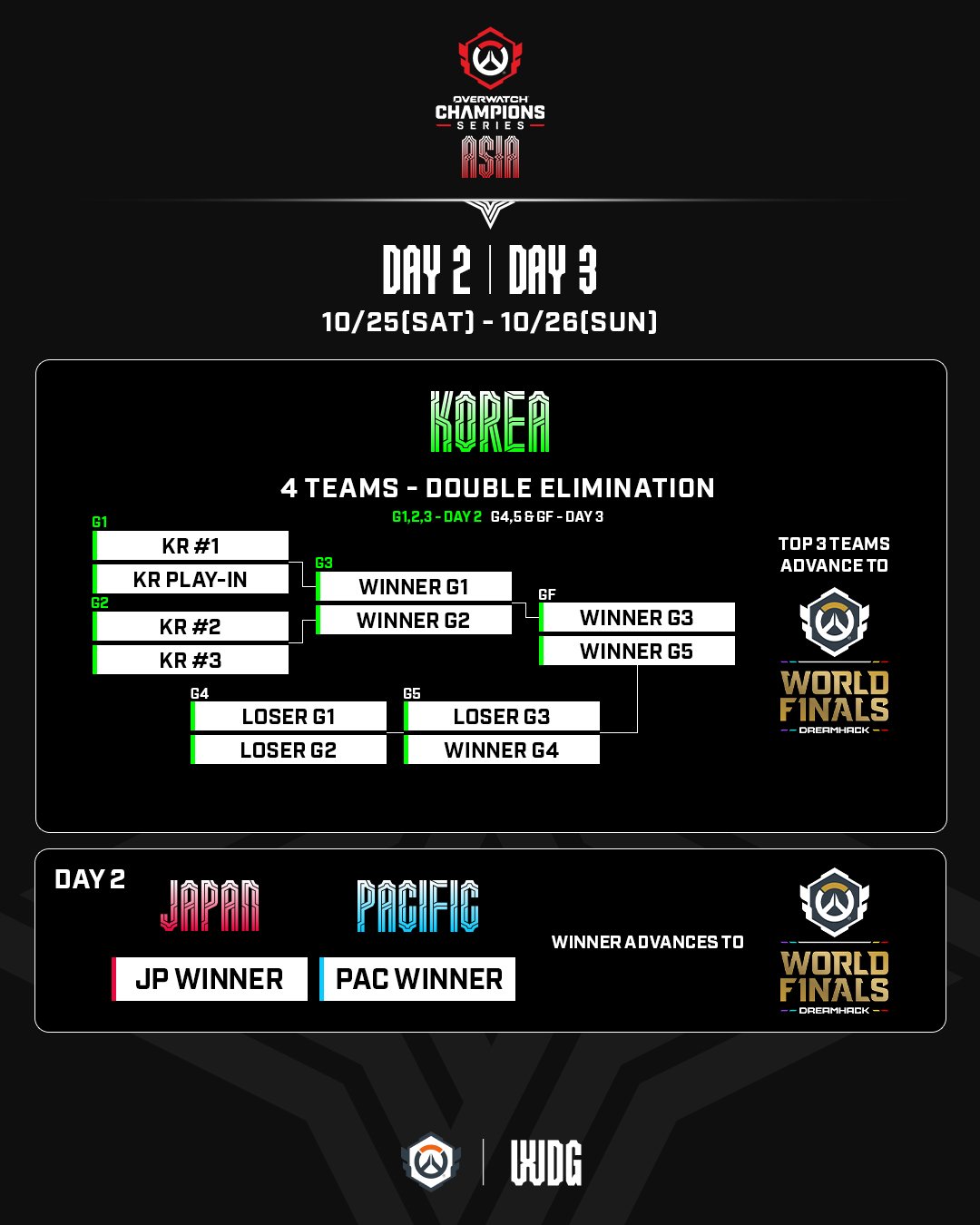 アジア地域は、日本、韓国、太平洋地域に分かれて大会を実施。今回、韓国・ソウル(弘大)で行われる「OWCS ASIA」は、アジア地域の代表による、世界大会「Overwatch Champions Series 2025 World Finals」への出場権をかけた大会。10月24日~25日に日本と太平洋地域代表による「Japan vs Pacific Road to World Finals」が行われ、日本からはREJECTとVARRELが出場する。同時に、10月24日~26日には韓国チームによる「Korea Road to World Finals」が行われる。
