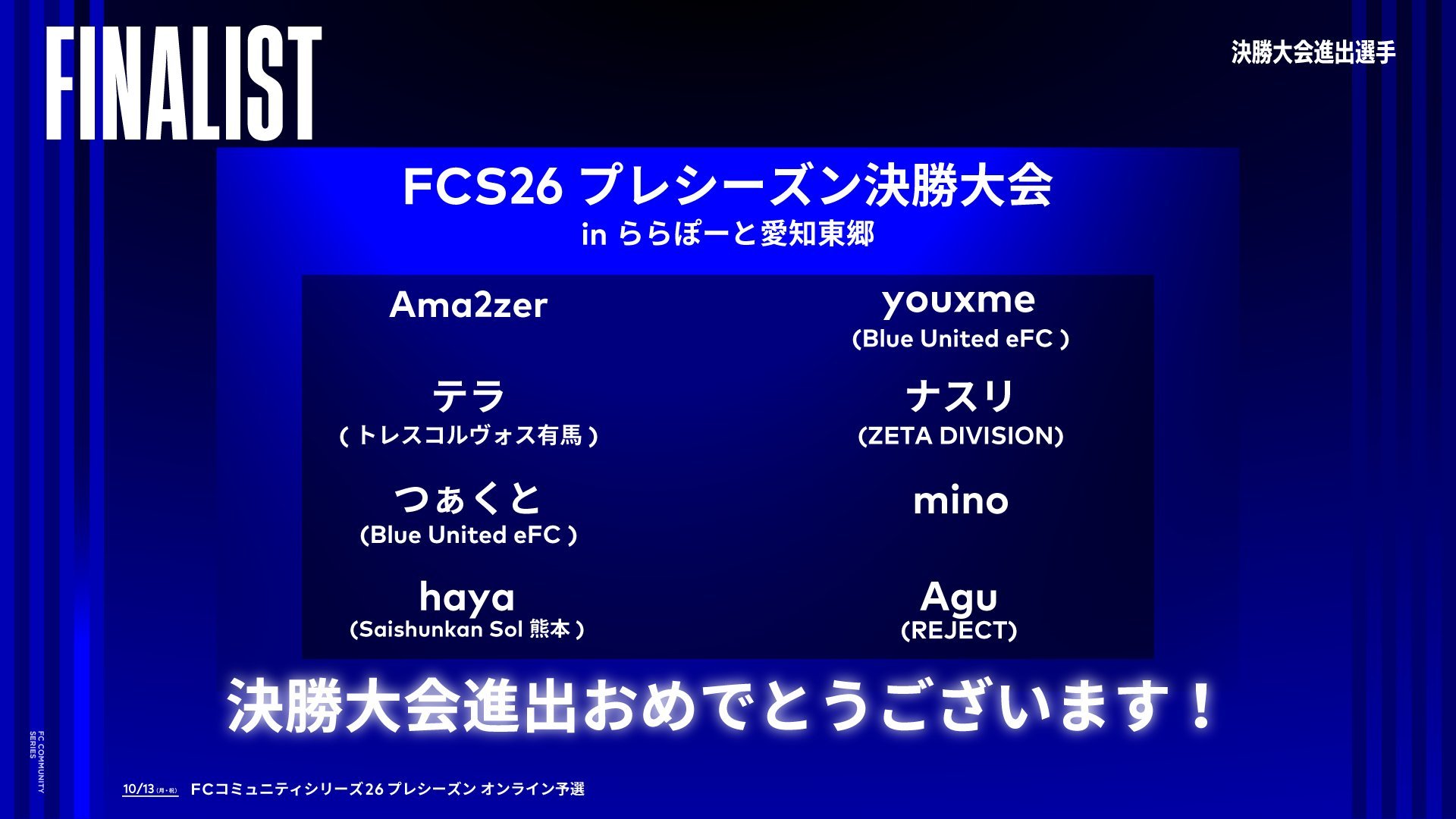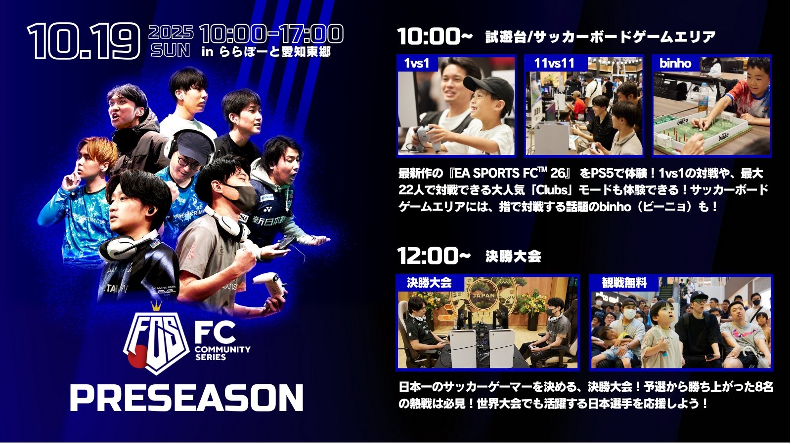 『EA SPORTS FC™ 26(FC 26)』を使用した日本国内eスポーツ・サッカー大会シリーズ「FCコミュニティシリーズ26(FCS26)」のプレシーズンイベント。最新作『FC 26』のFUTモードを使用し、オンライン予選とオフライン決勝大会で構成される。