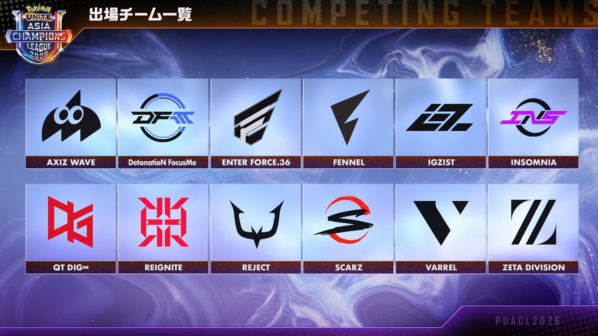 「Pokémon UNITE Asia Champions League(PUACL)」は、アジア地域を代表するトップチームが参加する『ポケモンユナイト』最高峰の大会。日本・アジア・インドの3地域でリーグ戦を行い、各地域の上位チームと招待チームが日本で開催されるオフライン決勝大会「PUACL2026 FINALS」で戦う。