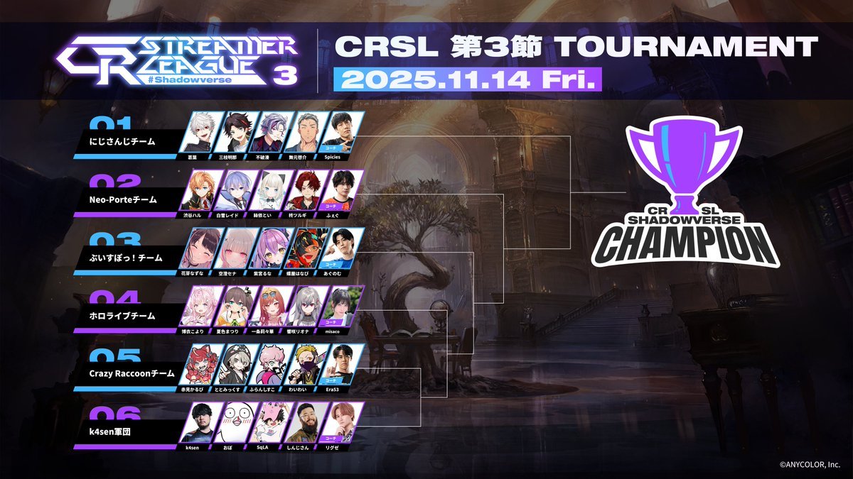 プロeスポーツチームCrazy Raccoonが主催する、人気ストリーマーによる『シャドウバース ワールズビヨンド』長期リーグ戦。第1節(8月15日)から第3節(11月14日)まで全3回行われ、優勝賞金は2800万。