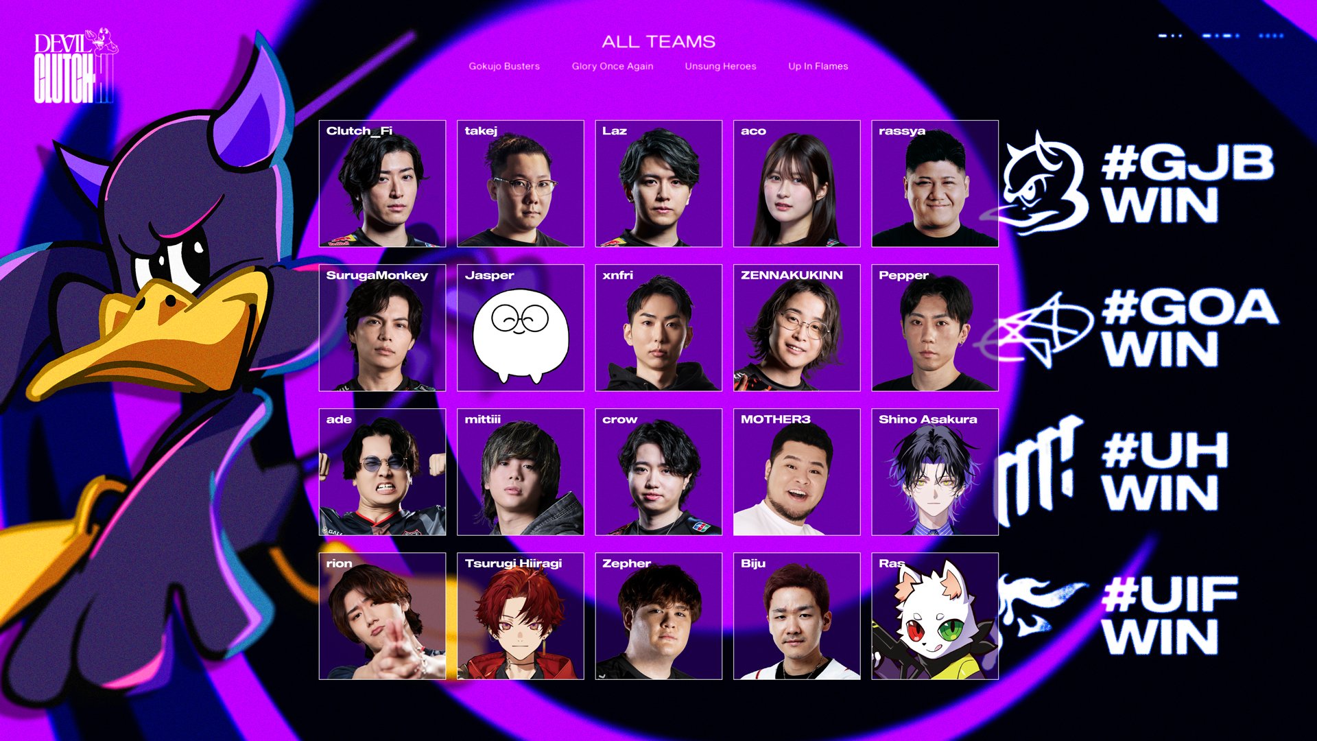 ZETA DIVISION所属Clutch_Fi主催、元プロ選手とストリーマーが混合チームを組んで対戦する『VALORANT』大会。全4チームが11月3日(月)~12月8日(月)の約1カ月のスクリムを経て、12月9日(火)にオンライン予選を行い、その後、今年のDevil Clutch杯の集大成として、12月11日(木)に横浜BUNTAIにてオフラインで3位決定戦・決勝戦を行う。