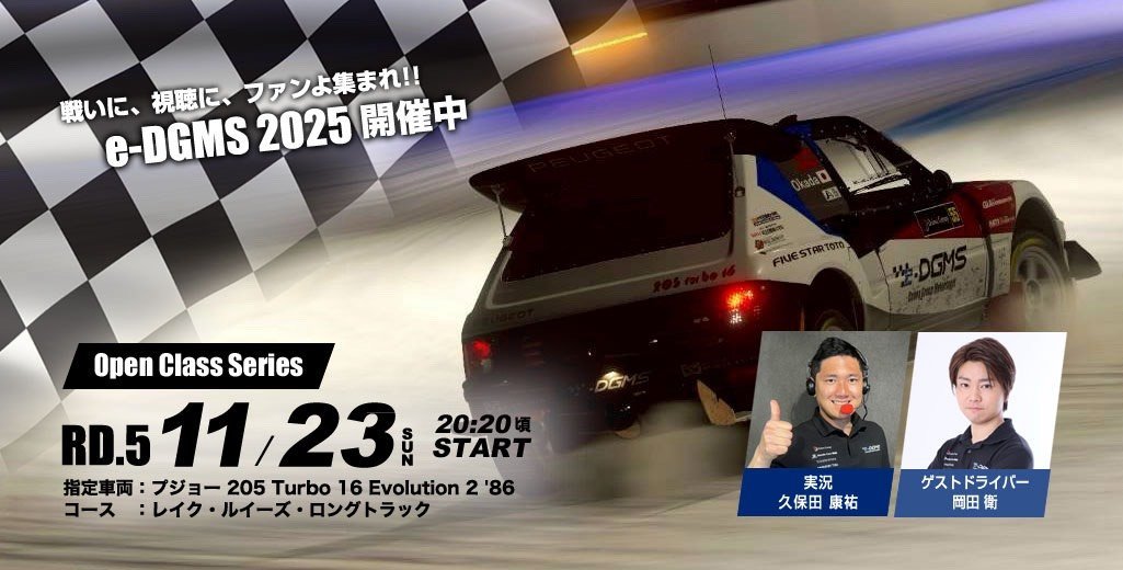 株式会社ダイワグループが主催する『グランツーリスモ7』を使用したeモータースポーツ・オンライン大会「e-DGMS 2025 by グランツーリスモ」。2025シーズンは自動車整備士養成学校在学生を対象とした「Technical College Series」、従来の一般参加枠[一般部門]をリニューアルした「Open Class Series」が行われる。