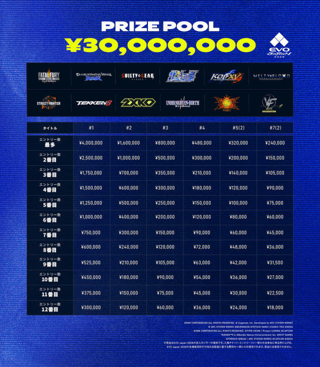 世界最大の格闘ゲームの祭典「EVO」の日本版。2026年は東京ビッグサイトにて3日間にわたって開催される。2026年大会では、前回を上回る12タイトルを実施。賞金総額は前回の2倍の3000万円に拡大した。