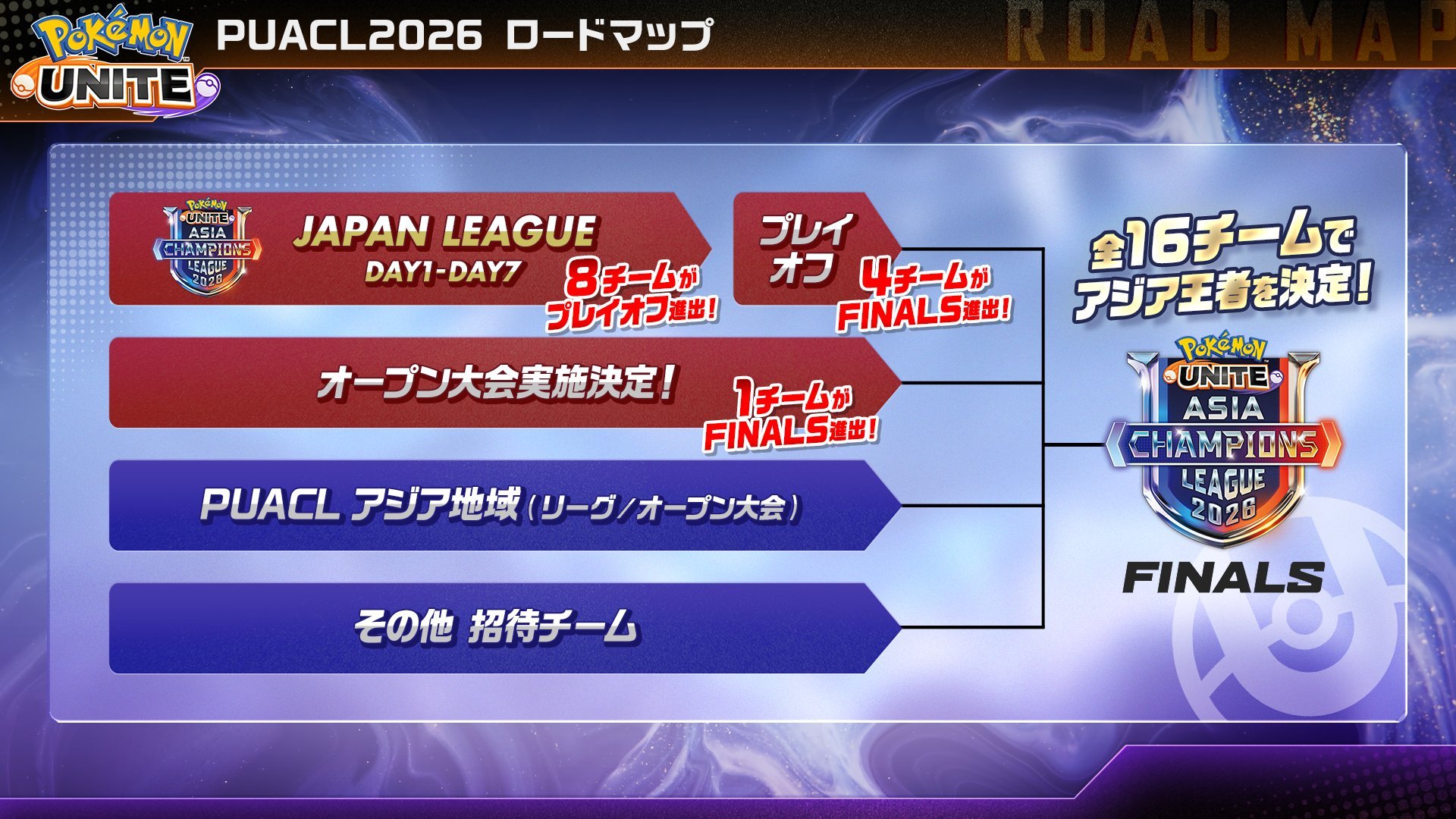 「Pokémon UNITE Asia Champions League(PUACL)」は、アジア地域を代表するトップチームが参加する『ポケモンユナイト』最高峰の大会。日本・アジア・インドの3地域でリーグ戦を行い、各地域の上位チームと招待チームが日本で開催されるオフライン決勝大会「PUACL2026 FINALS」で戦う。