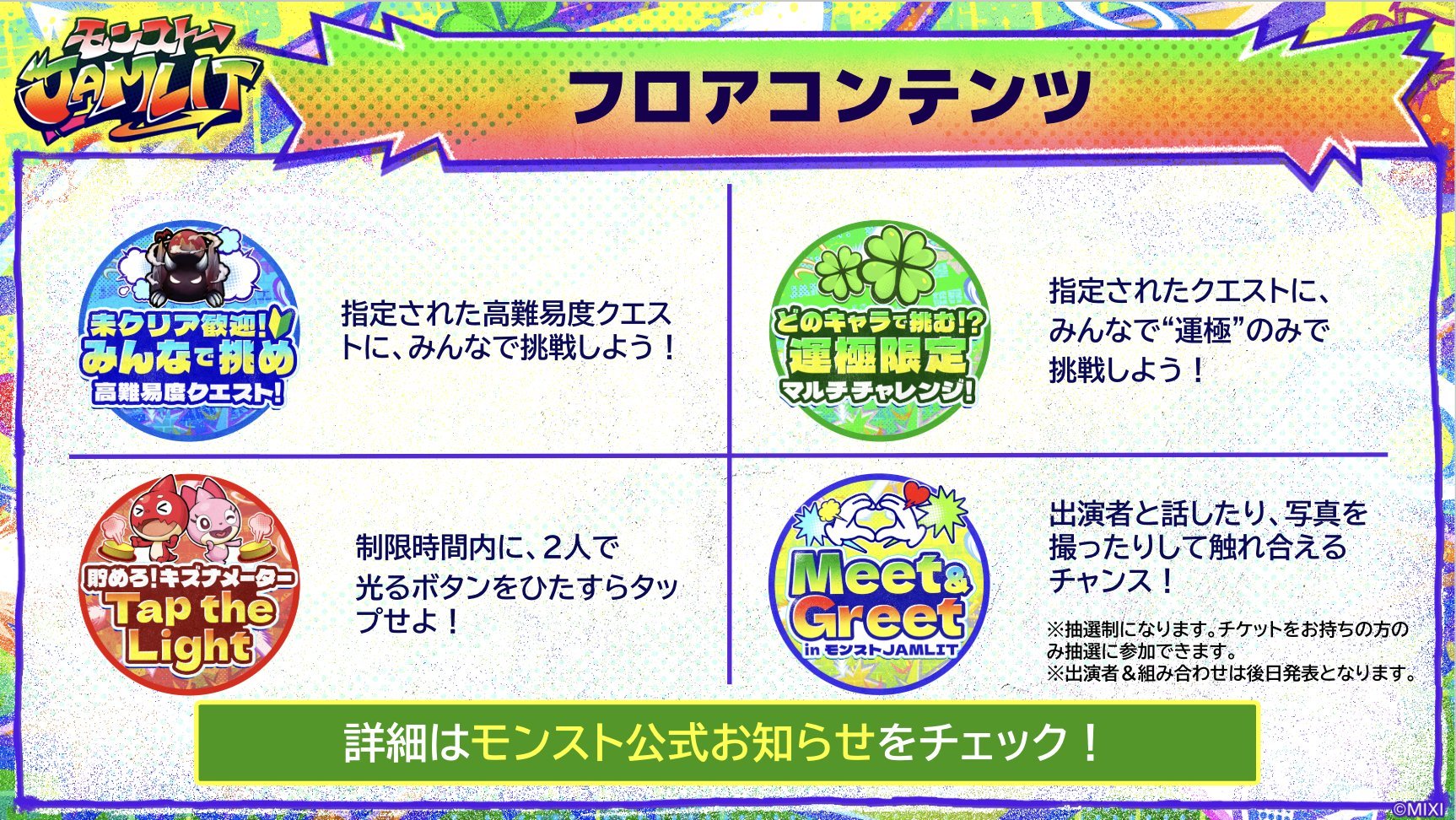 なお、当日の12:00より入場チケットを持っていなくてもフリーエリアに入場可能となり、「Meet&Greet!inモンストJAMLIT」以外のフロアコンテンツを体験可能。ステージコンテンツの観覧は、有料エリア外から立ち見となる。