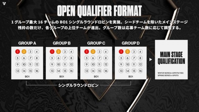 オープン予選を勝ち抜いたチームが合流する「MAIN STAGE 1」から参戦するシードには、WINTER SERIES上位のFENNEL、Rising Gaming、Clocks、L Guide Gamingに加え、「LCP 2026」のアカデミーチーム「DetonatioN FocusMe Academy」の5チームが参戦する。