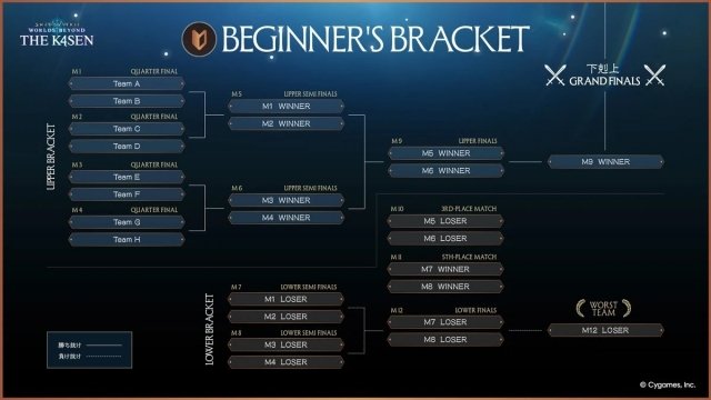 初心者/経験者それぞれのトーナメントにて順位が決まるが、最終的に「下剋上 - GRAND FINALS」として、経験者最下位チームと初心者優勝チームが対戦し、勝者を決める。