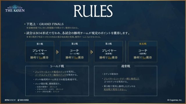 DAY1(4月22日)は練習日として通常戦(2デッキ)を提出する。DAY2(4月23日)はシールド戦のデッキ(コーチ、プレーヤーそれぞれ1デッキ)を提出し、本戦も行う。
