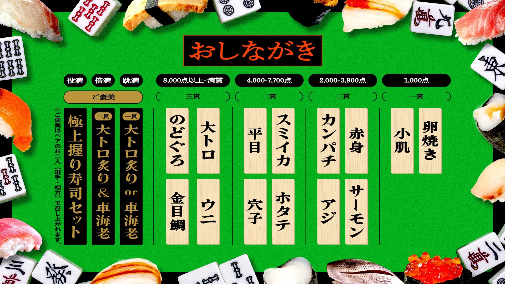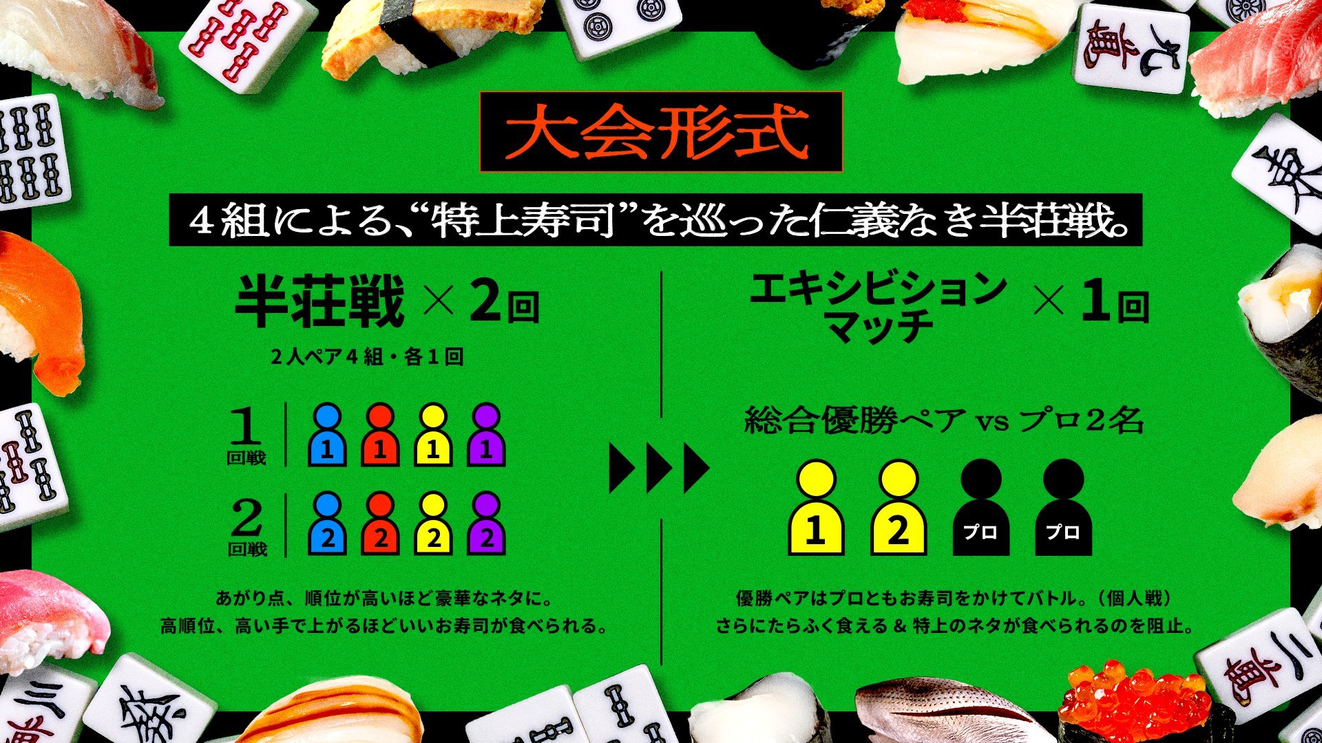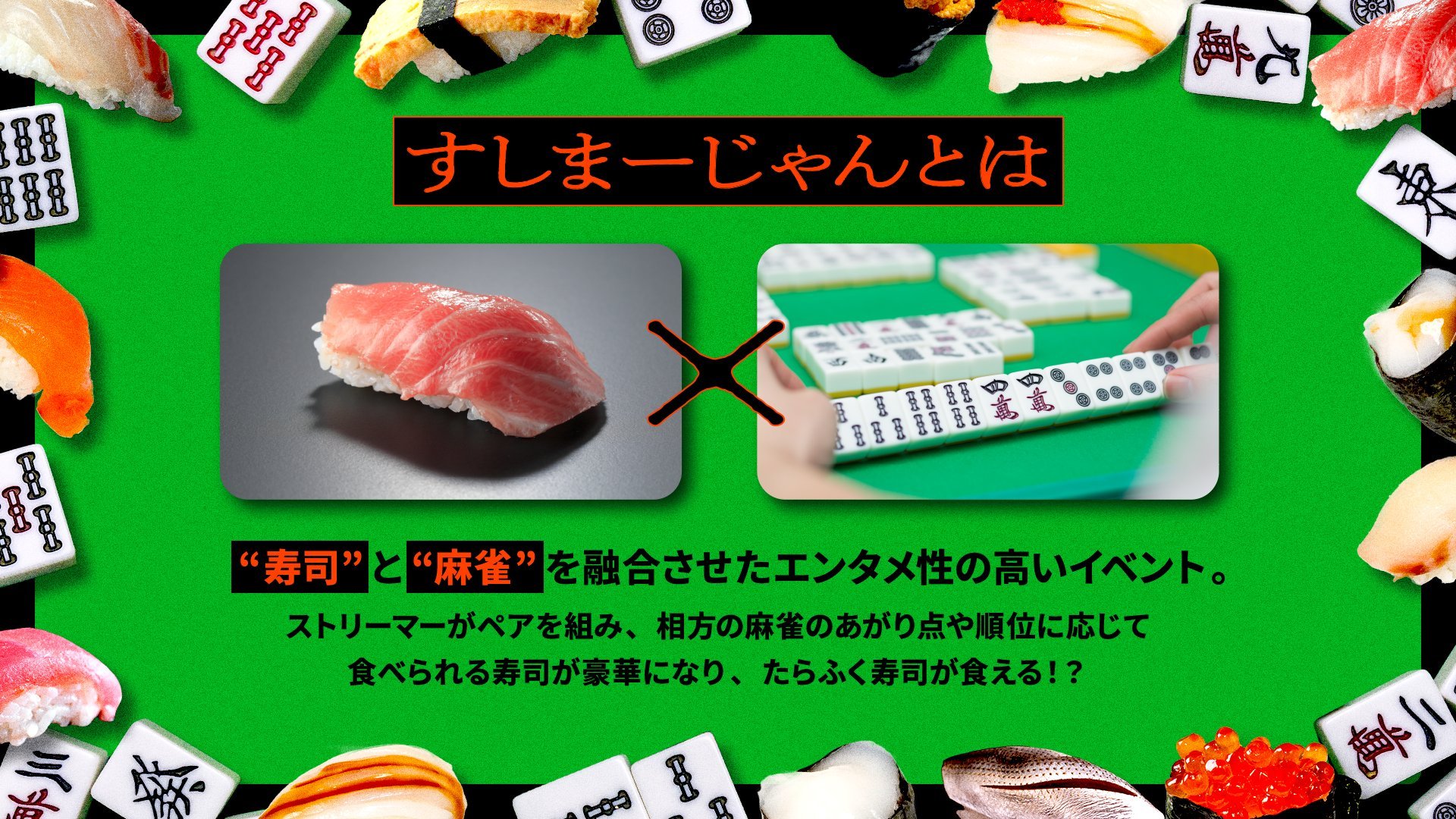 REJECTが開催する、寿司と麻雀を組み合わせたバラエティ型eスポーツイベント。ストリーマーがペアを組み、相方の麻雀の得点や順位に応じて食べられる寿司の内容が変化するユニークなルールが特徴。第二回となる今回は、より多くの視聴者が楽しめる形へと進化している。